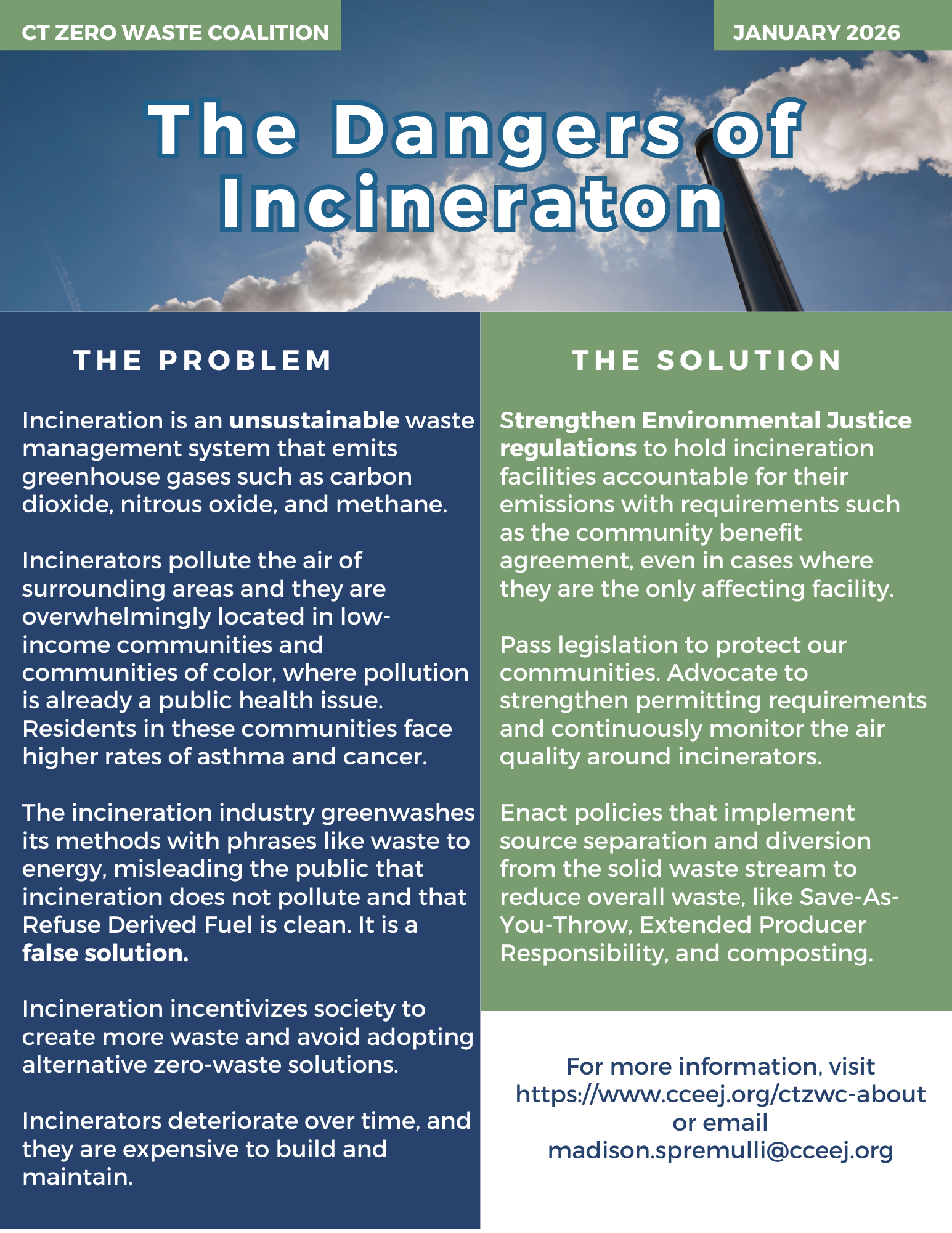 The mission of this coalition is to promote the physical and economic well-being of Connecticut residents and address the waste crisis through donating and recycling organics, fair and equitable unit-based pricing, advancing reuse and waste reduction behaviors, and opposition to all new and existing trash incinerators and landfill-related infrastructure. We advocate for a zero waste, circular economy that will benefit residents and the environment for generations.